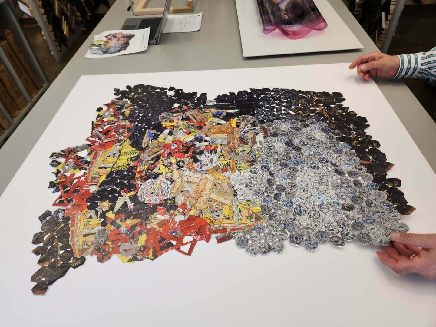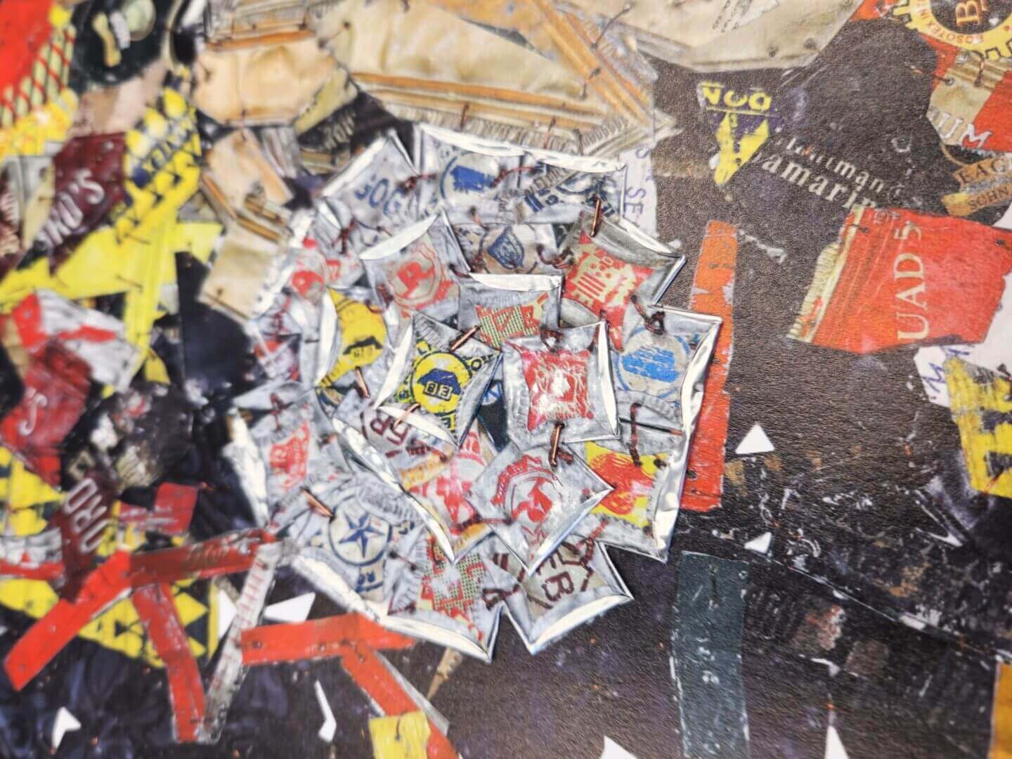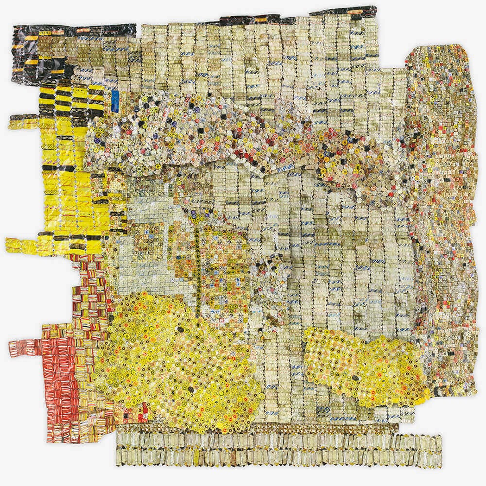 His most acclaimed pieces involve thousands of folded and crumpled aluminum bottle caps, expertly bound together with copper wire. These sculptures, which are both luminous and weighty, achieve a remarkable balance between meticulous craftsmanship and a dynamic adaptability that allows them to take on new forms with each installation.